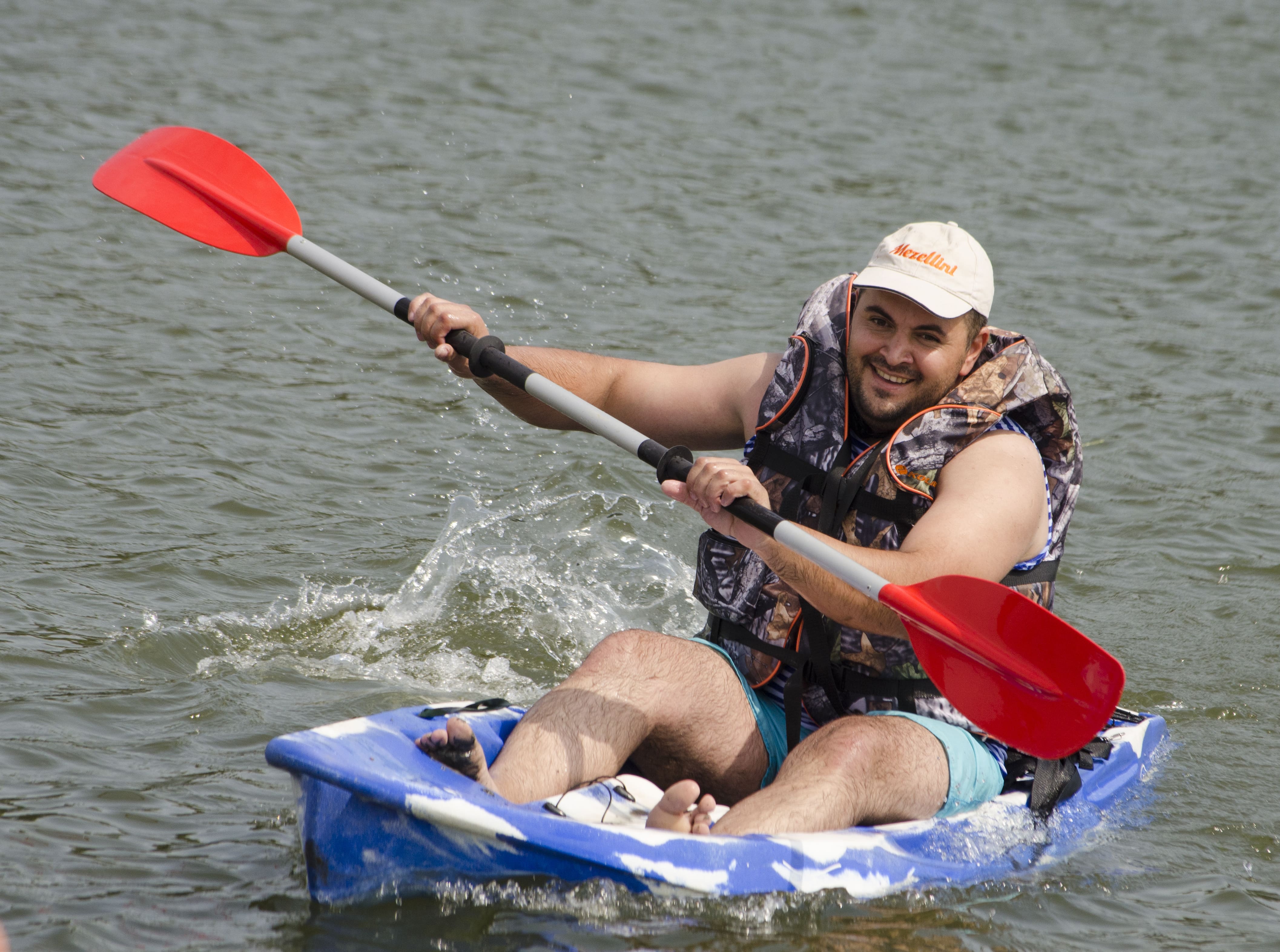 Participanți într-o cursă pe apă cu bărci improvizate, activitate de teambuilding tip Goana Corsarilor, ideală pentru spirit de echipă și distracție